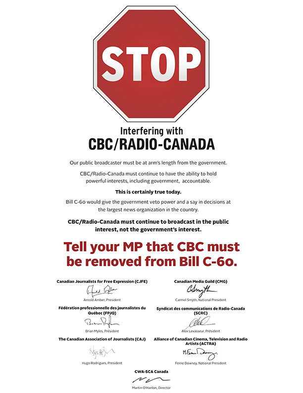 "The government already has powerful influence over the CBC because it appoints the president and board members and sets the budget," said O'Hanlon. "Bill C-60 would take that influence to a troubling new level, giving the government unprecedented control over the operation of the public broadcaster."